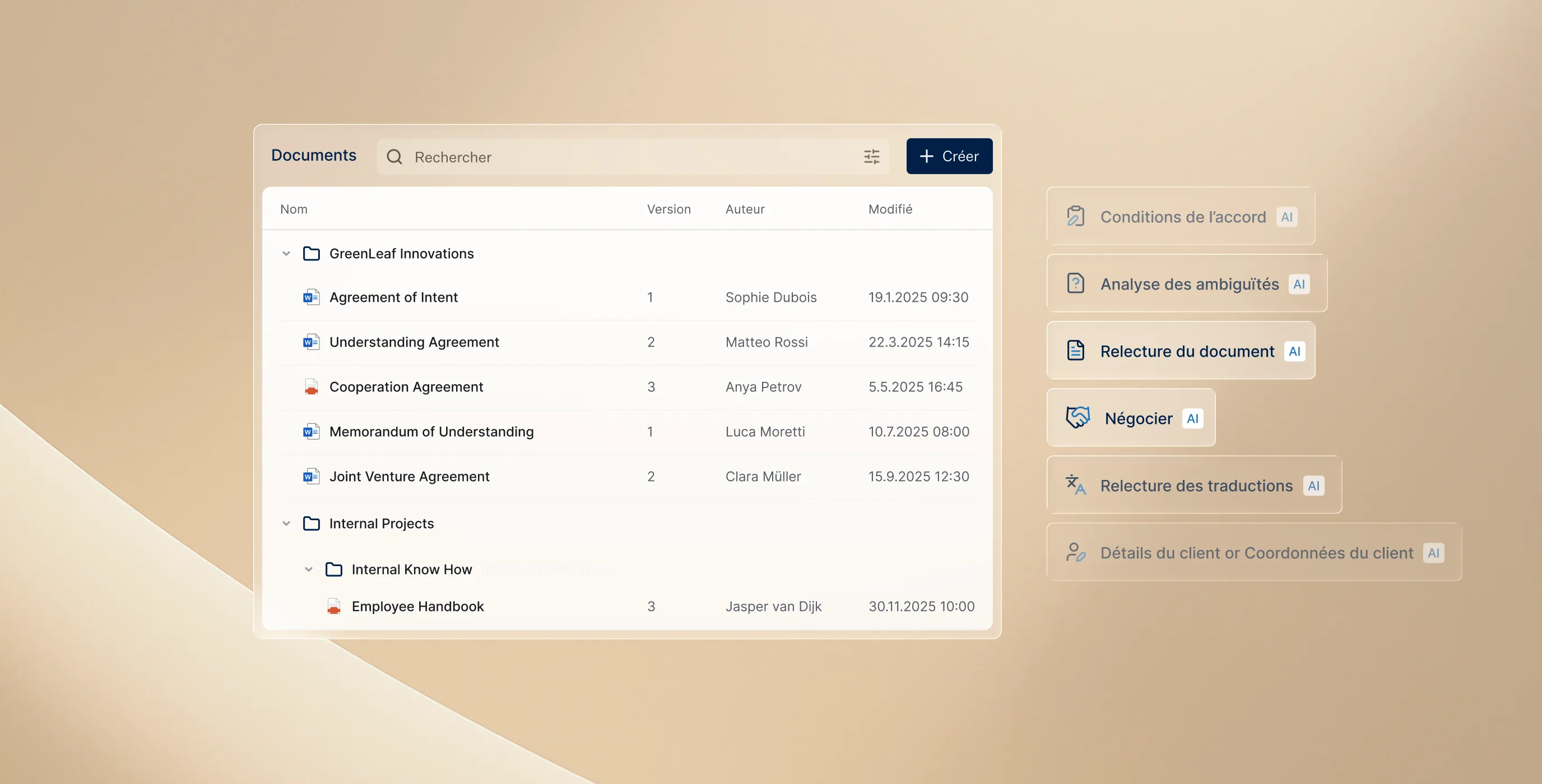 De la gestion intuitive des documents à la rédaction assistée par l’IA et au suivi automatisé du temps – chaque fonctionnalité est conçue pour aider votre cabinet à travailler plus vite, plus clairement et avec plus d’impact.